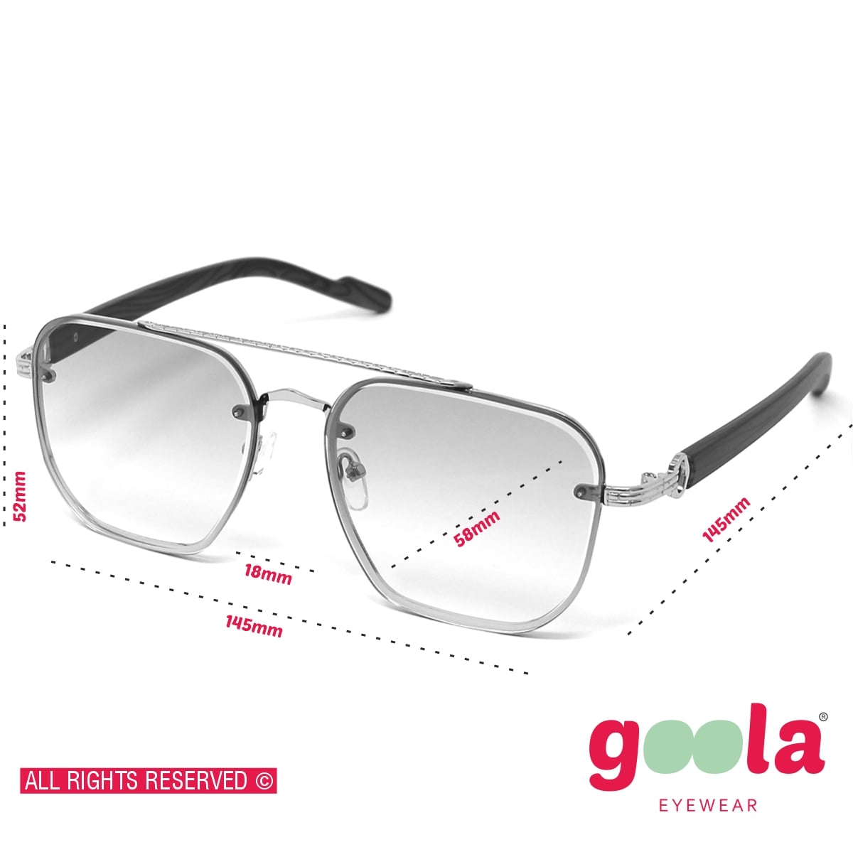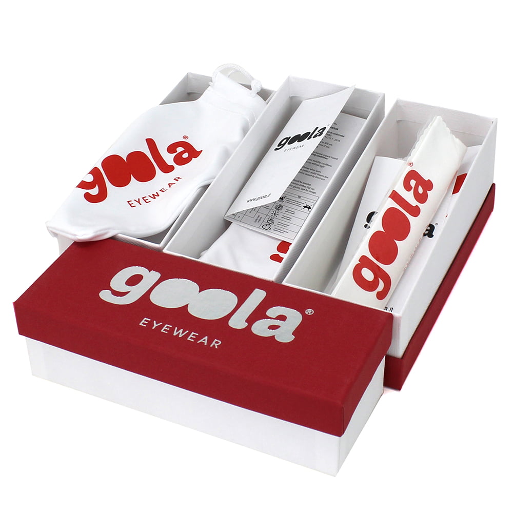 Jas, montatura grande e rettangolare con doppio ponte. Aste in policarbonato ed in parte in metallo, naselli gommati regolabili. Le lenti presentano una particolare incisione lunga tutto il perimetro. Lenti certificate UV400.