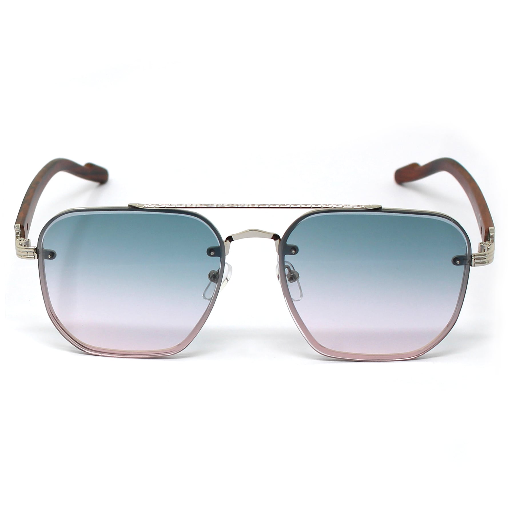 Jas, montatura grande e rettangolare con doppio ponte. Aste in policarbonato ed in parte in metallo, naselli gommati regolabili. Le lenti presentano una particolare incisione lunga tutto il perimetro. Lenti certificate UV400.