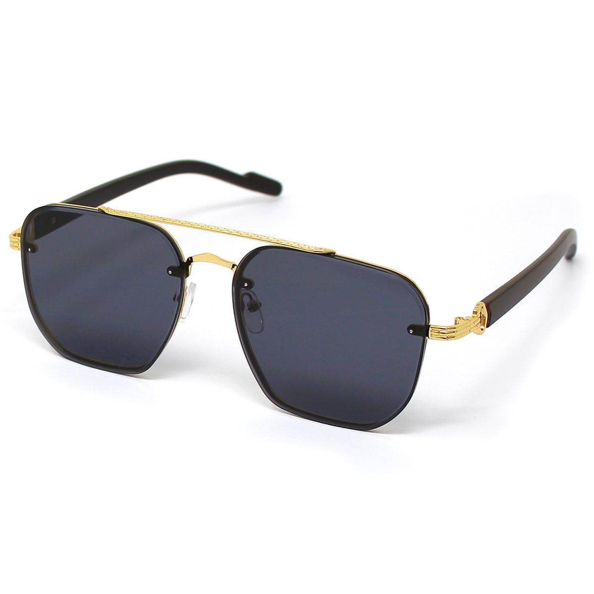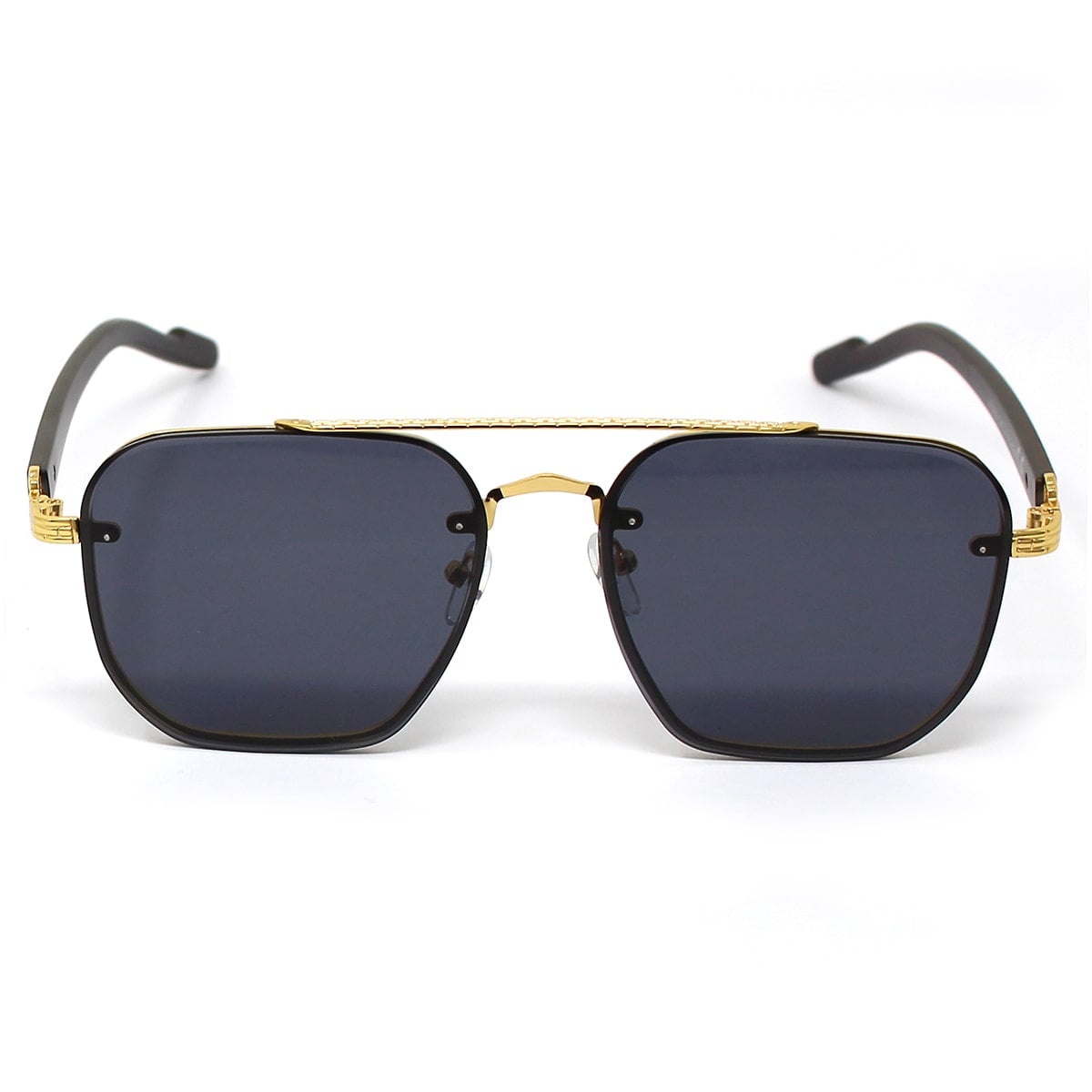 Jas, montatura grande e rettangolare con doppio ponte. Aste in policarbonato ed in parte in metallo, naselli gommati regolabili. Le lenti presentano una particolare incisione lunga tutto il perimetro. Lenti certificate UV400.