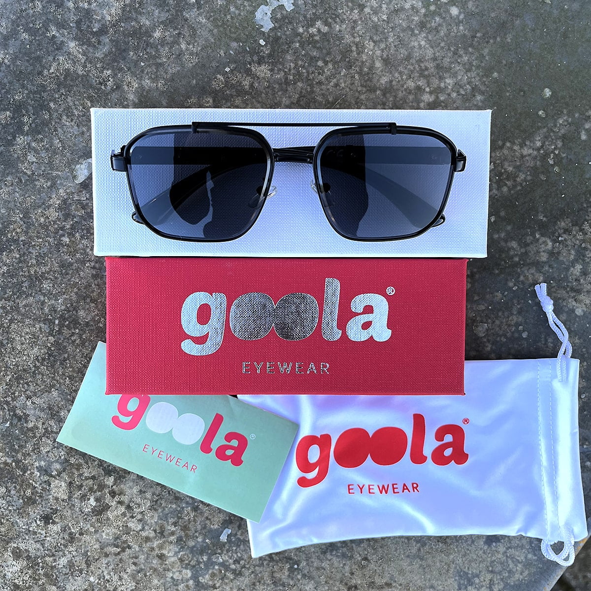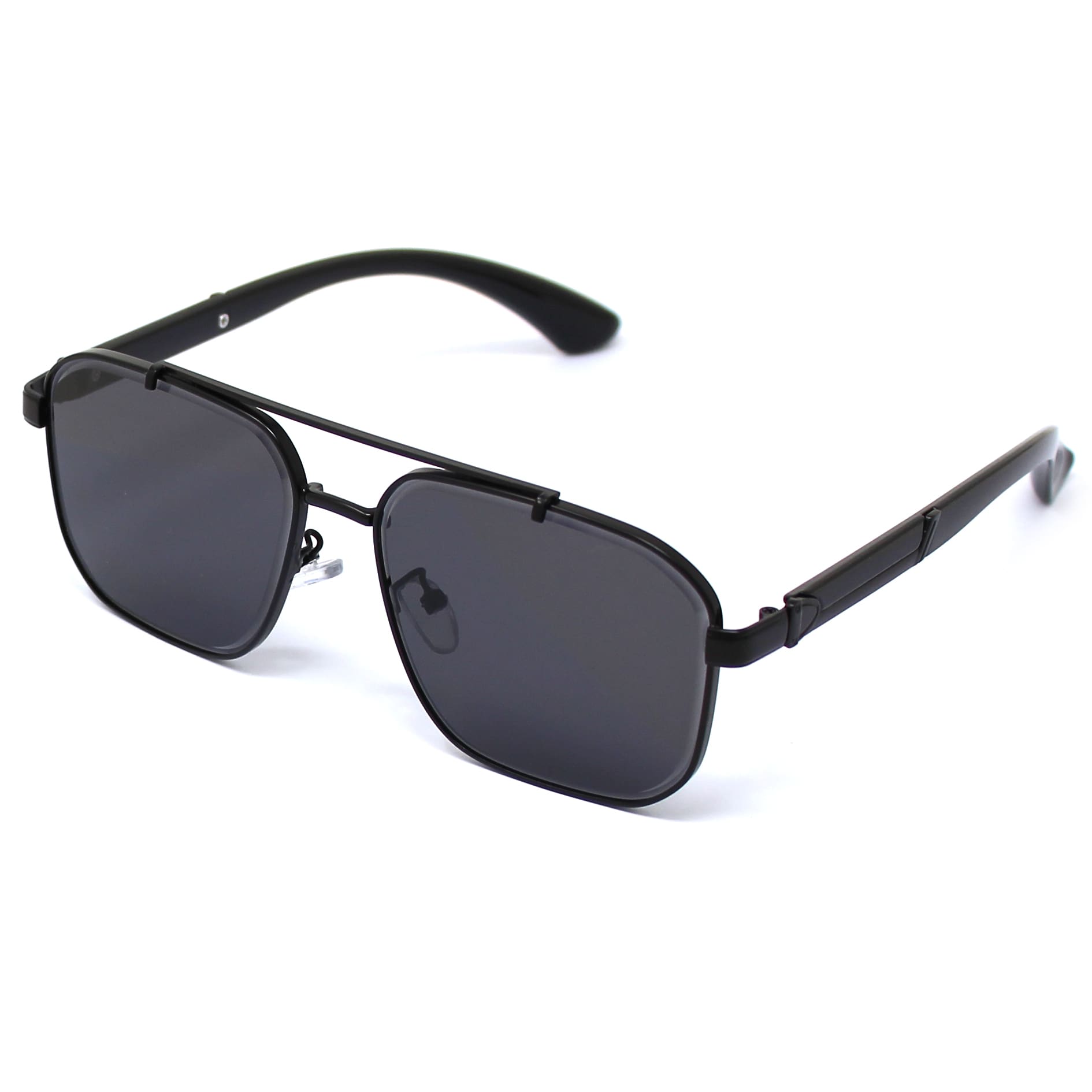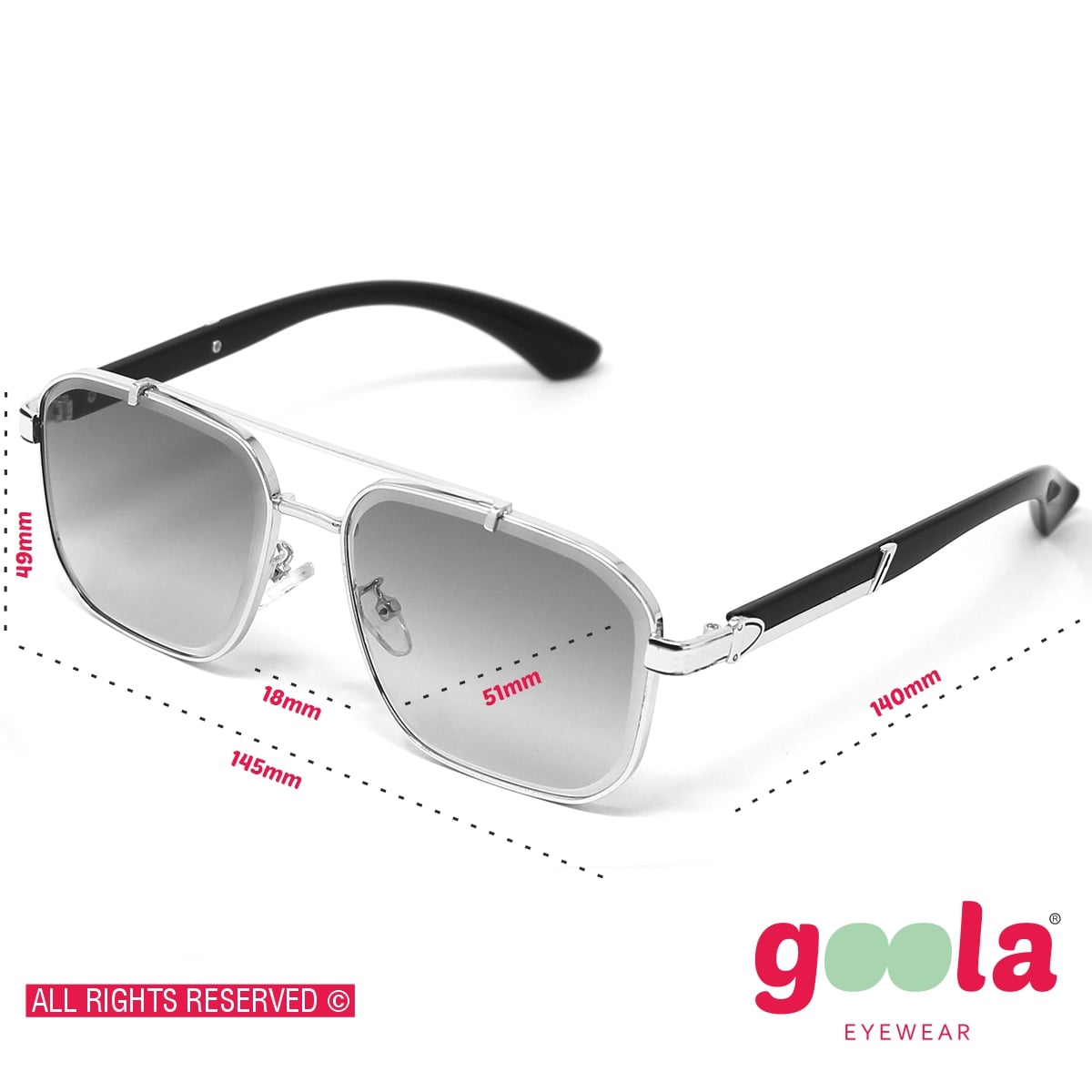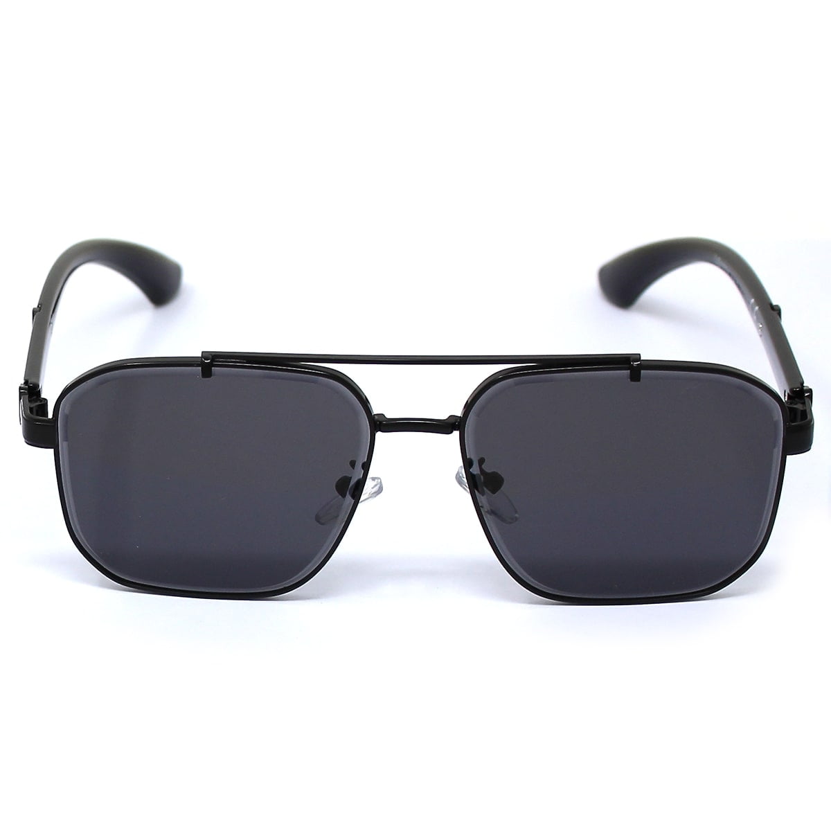Sive, montatura grande e rettangolare con doppio ponte. Aste in policarbonato ed in parte in metallo, naselli gommati regolabili. Le lenti presentano una particolare incisione lunga tutto il perimetro. Lenti certificate UV400.